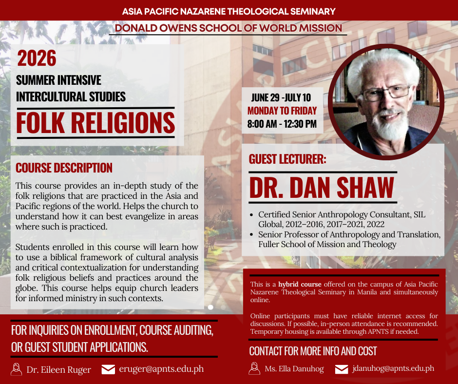 The Asia-Pacific Nazarene Theological Seminary (APNTS), through the Donald Owens School of World Mission, is pleased to announce the 2026 Summer Intensive Intercultural Studies Course: Folk Religions.
