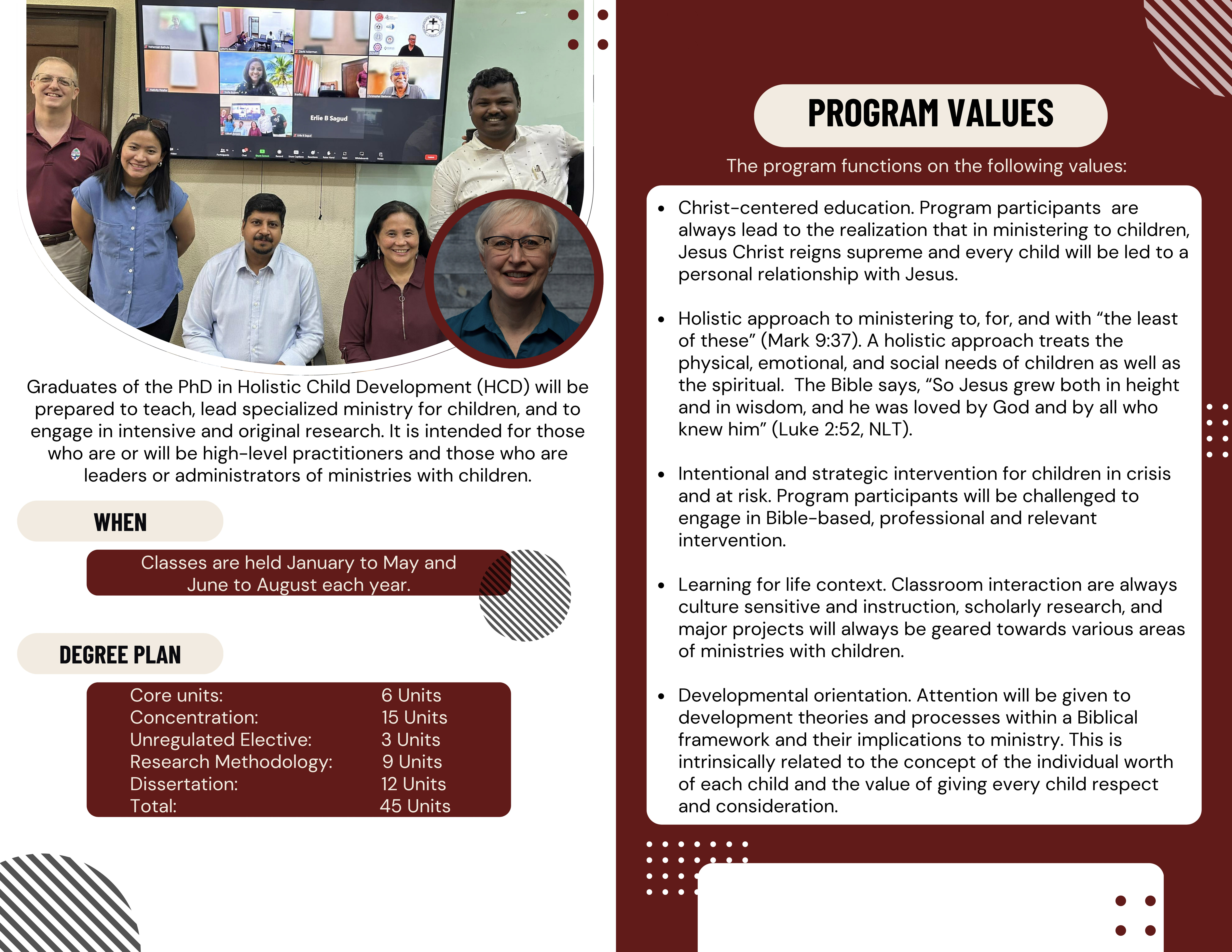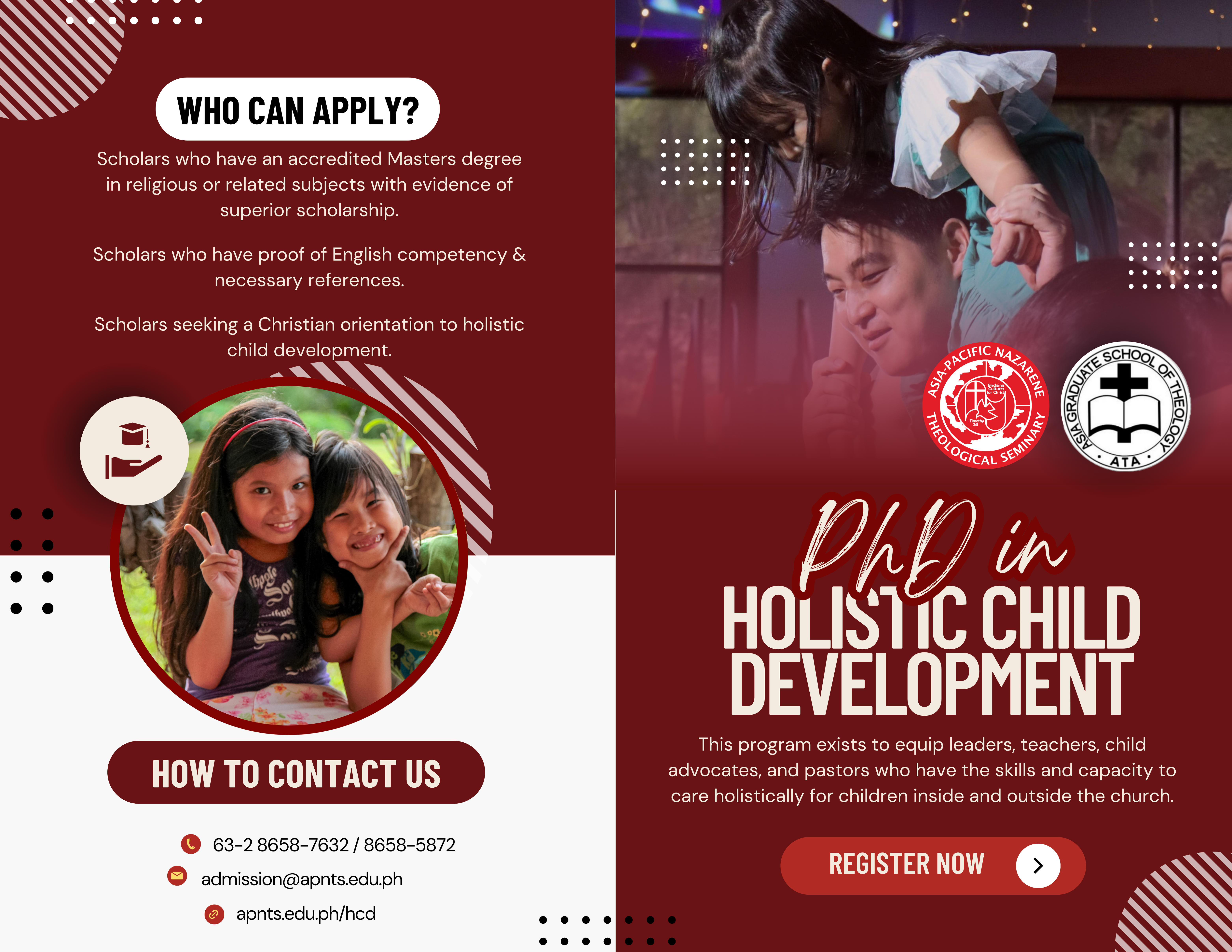 On December 5-6, 2007, seminary key leaders and Compassion International (CI) met to develop an HCD program at APNTS. During the consultation done on the APNTS campus, the group formulated initial courses for the HCD program. The program began with the certificate level with modules in summer of 2008. The group commissioned Dr. Nativity A. Petallar to collaborate with Dr. Floyd T. Cunningham, Rev. Dan Balayo, and CI (represented by Menchit Wong and Dr. Dan Brewster) to work on courses that will be suitable for the MA in HCD as well as for the PhD in HCD. In November 2009, the first PhD in HCD class was held with five students: one Indian and four Filipinos. From then on, professors from various parts of the world came to teach at APNTS equipping students for holistic ministries with children. In January 24, 2012, the Commission on Higher Education (CHED) granted permit and recognition to the PhD in HCD. In 2018, the PhD in HCD was accredited by the Asia Theological Association (ATA). Then, in 2022, CHED granted the 45-unit curriculum design that APNTS proposed. The following is the program design for the PhD in HCD.